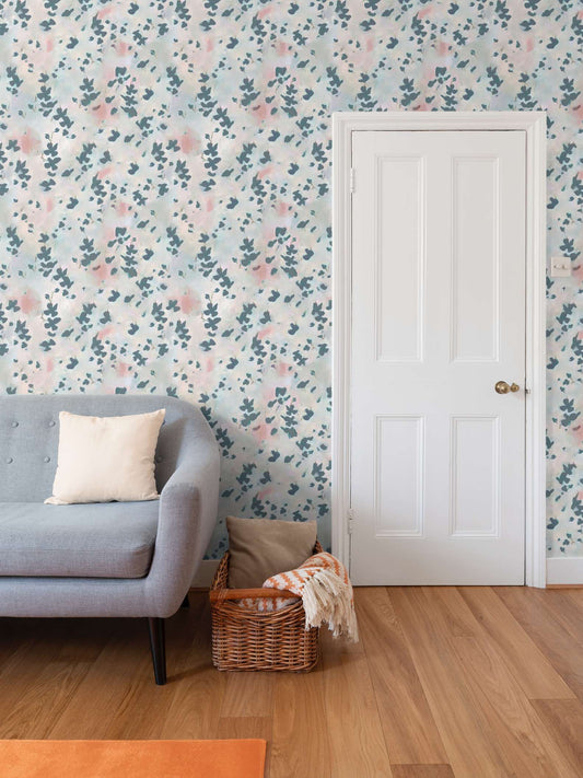 'Oops a daisy' wallpaper in pastel blue and pink colours